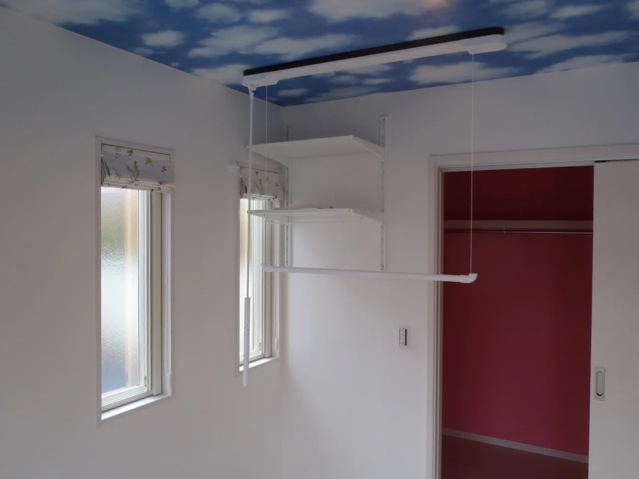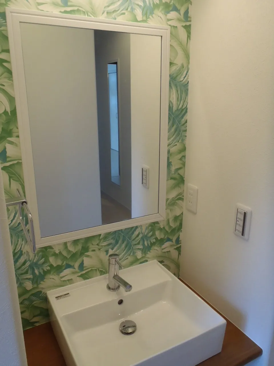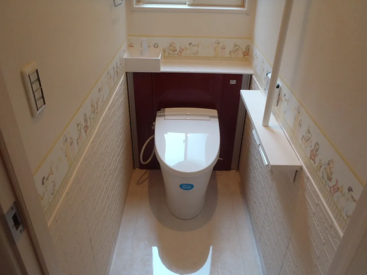 奥様のこだわりが、あえて収納部分にオシャレなアクセントクロスを使い、トイレにはかわいい帯状の壁紙(キャラクター)を、下半分には消臭・吸湿効果が抜群なエコカラットを使い、リビング一部にも使用しました。