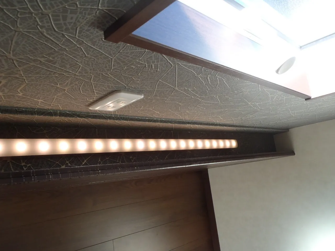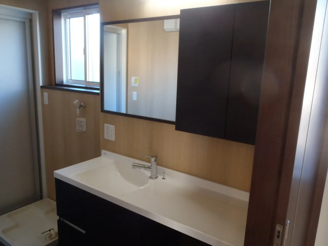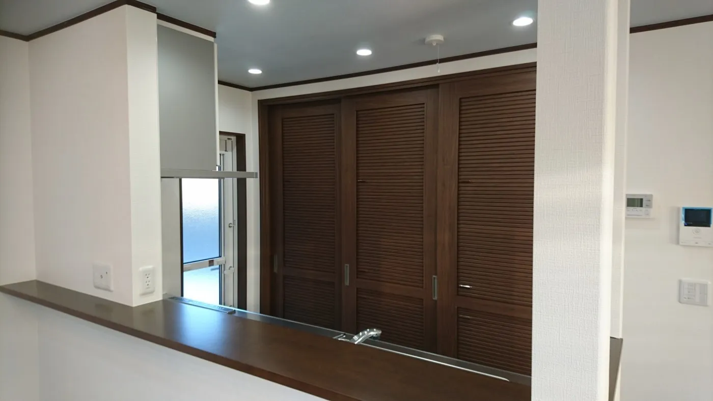 奥様のご希望である、食器棚はお料理中以外は隠したいとのことで通気性のある横格子引き戸にしました。