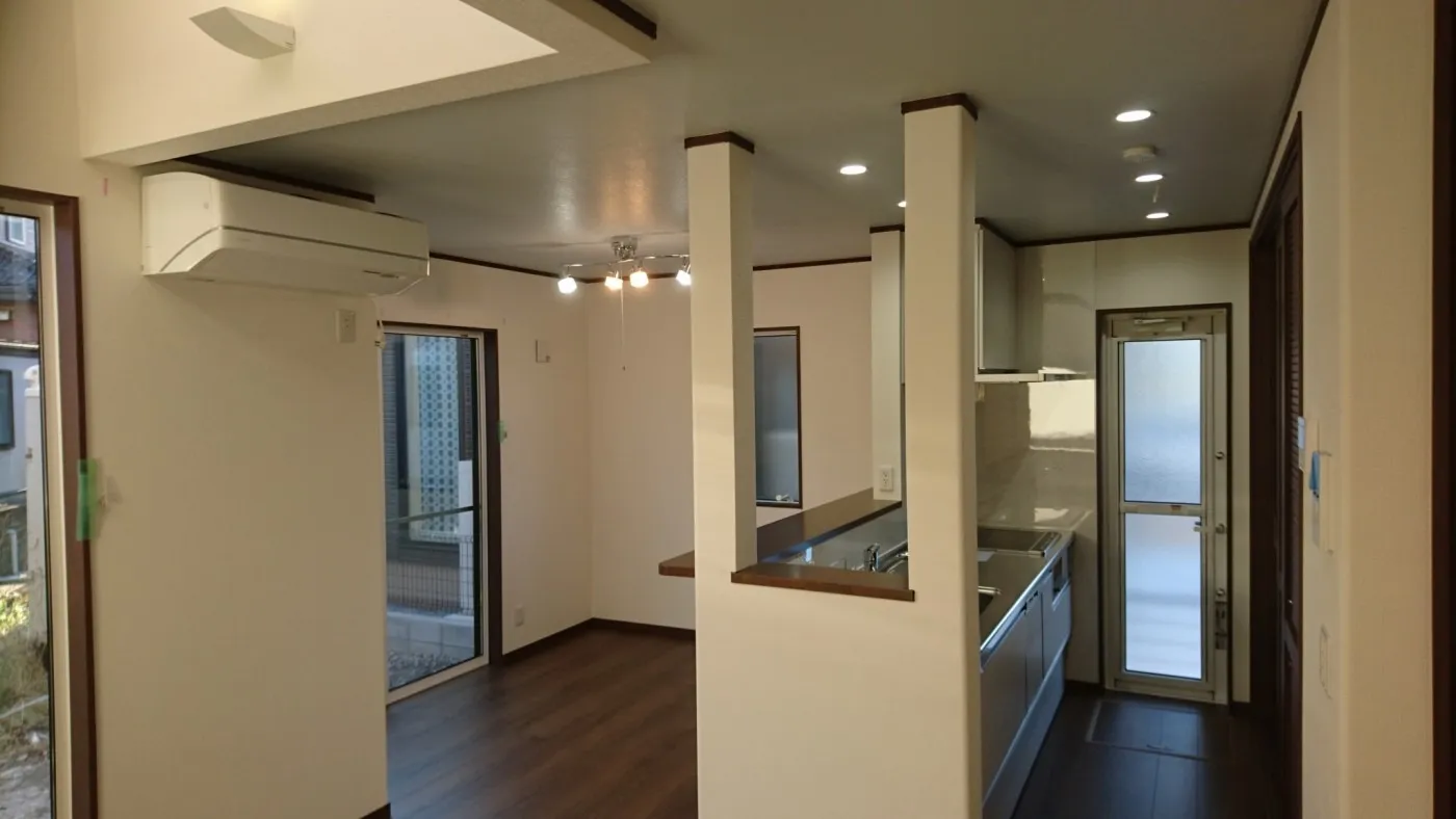 キッチン袖壁は開口して料理しながらでもお子様を見れるようにしました。