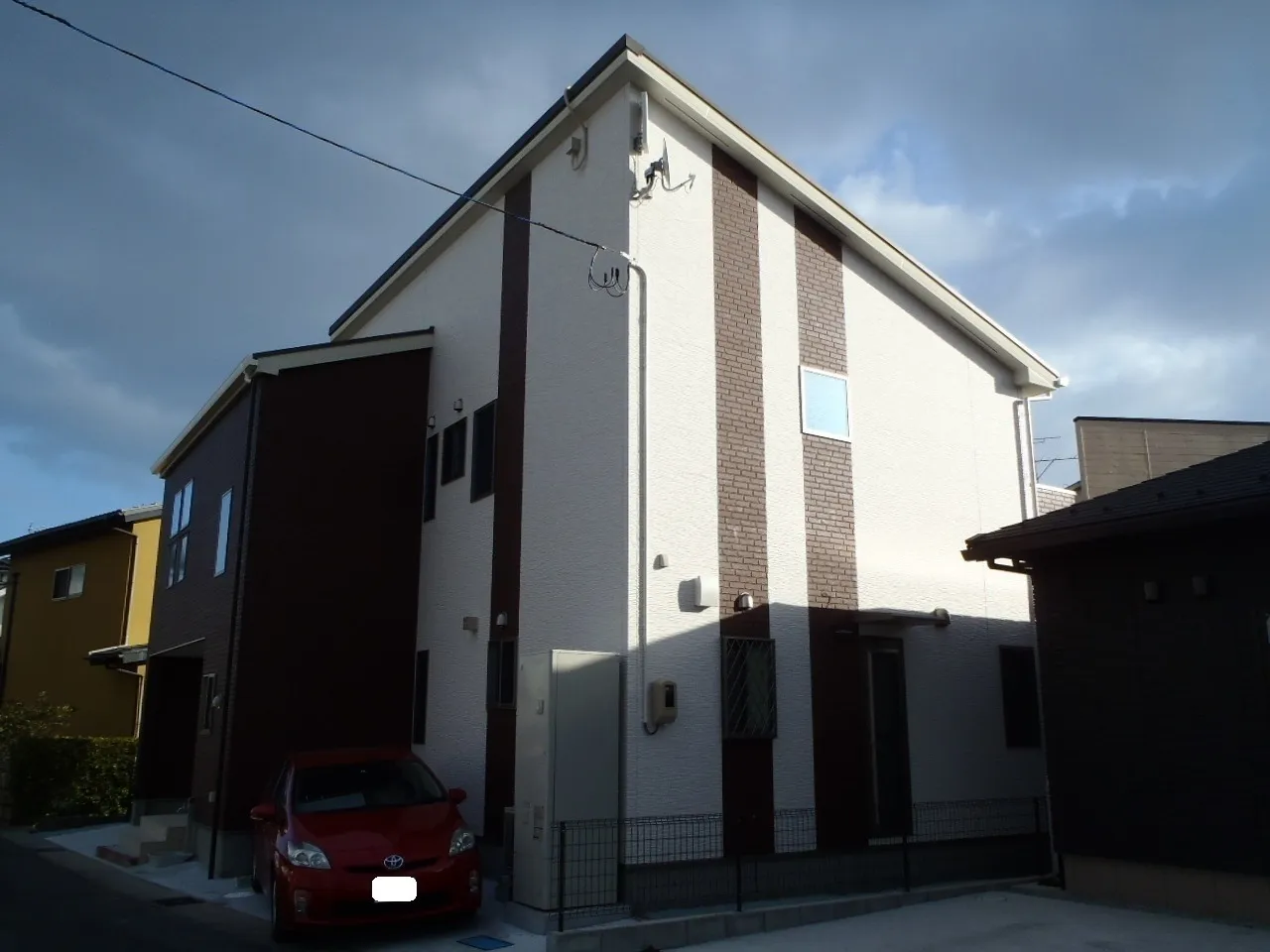 三角敷地ですがピロティ(建物下に車をとめれる)を使えるようプランを考えました。